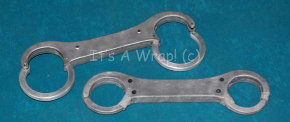 A lot of two restraints appearing in the Star Trek: Enterprise episode “Canamar”. The items are a soft molded rubber version with gray adhesive tape holding the restraints closed used for stunt purposes, and a similar pair made from sturdy molded rubber with machined metal features that close around the … |