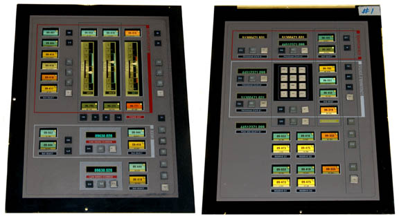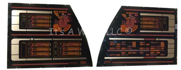 A pair of smoked acrylic computer interface panels painstakingly removed from set pieces and wall flats created for sets making up the “Enterprise NX-01” on Star Trek: Enterprise. The items both feature graphical applications on their fronts with multiple multi-colored faux rubber buttons in varying configurations. The graphics depict a … |