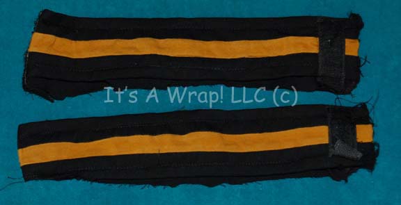 A pair of fabric elements created for use on Starfleet uniforms following the release of Star Trek VIII: First Contact and the Star Trek: Deep Space Nine episode “Rapture”. The items are operations gold division strips for use on the sleeve cuffs of the uniform made from black and blue … |