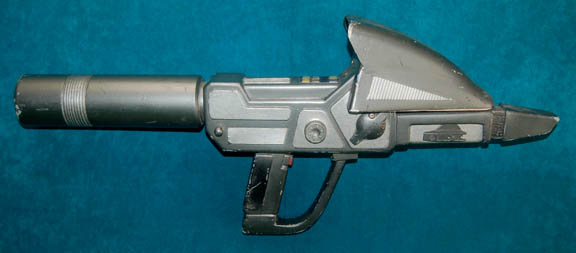 A prop energy weapon featured in the Star Trek: Deep Space Nine episode “Shakaar” for use by “Major Kira” (Nana Visitor). The prop weapon is solid cast resin painted metallic silver and gunmetal with multiple raised details and colored buttons. The item features a ‘display screen' and a painted red … |