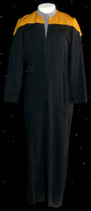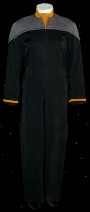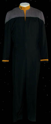 A Starfleet uniform jumpsuit made for various episode of season 1-5 of Star Trek: Deep Space Nine. The costume is black with operations gold division shoulders and a gray long sleeved turtleneck undershirt. The jumpsuit features a form fitting elastic waist with sewn in loops for ‘away team' gear and … |