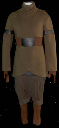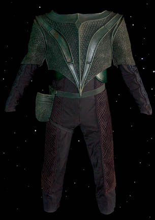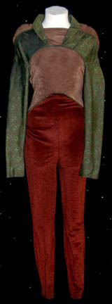A costume featured in the Star Trek: Deep Space Nine episode “Armageddon Game” for wear by a T'Lani’ soldier. The costume is a corduroy-like jumpsuit with a broken neoprene body and sleeve piece with a light shirt. The costumer’s tag reads ‘DS9 #433’ |
