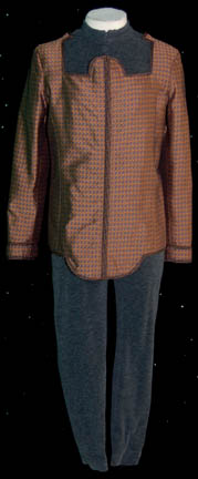 A costume made for actors portraying Bajoran soldiers on Star Trek: Deep Space Nine. The costume is gray colored corduroy trousers and a matching jacket with black diamond thread patterned suede sleeves. The costume comes with a matching vinyl belt, a pair of matching painted leather boots with vinyl accents, … |