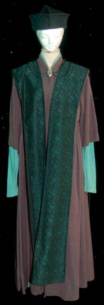A costume features in various episodes of Star Trek: Deep Space Nine for wear by a ‘Bajoran Vedek'. The costume is composed of a pair of sea foam colored trousers and a shirt with a gray robe and a green patterned tabard with a large silver colored metal Bajoran symbol … |