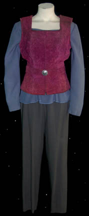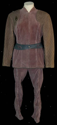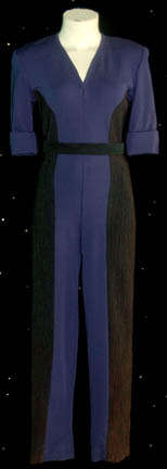 A costume featured in various episodes of Star Trek: Deep Space Nine for wear by “Kasidy Yates” (Penny Johnson) when operating as captain of her freighter ship. The costume is a purple jumpsuit with dark wood grain pattern sides going up and down the ribs and legs, with a belt … |
