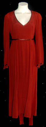 A rust colored gown and matching jumpsuit worn by Nana Visitor during her portrayal of “Major Kira” in various episodes of Star Trek: Deep Space Nine. The costume zips up the back and is extremely light, featuring shiny trim at the neckline and cuffs and another around the belly. The … |