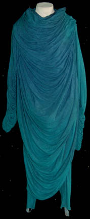 A costume featured in various episodes of Star Trek: Deep Space Nine for wear by background actors portraying a “Blue Fat Alien”. The costume is a large draping gown with stripe textured fabric, pleating in the front to create a paired ribbed draping effect on the chest and sleeves, an … |