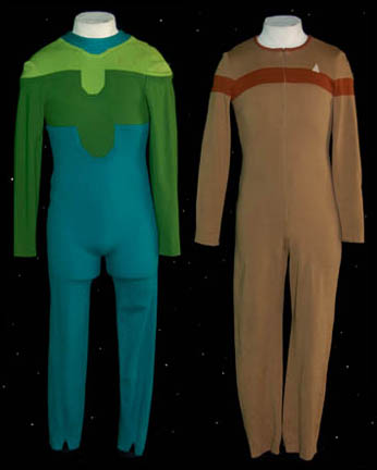 A lot of two full length form fitting jumpsuits made for the character of “Jake Sisko” (Cirroc Lofton) in Star Trek: Deep Space Nine. One is a three hue green jumpsuit with a costumer's tag reading ‘DS9 Jake, Cirroc Lofton, 1st season + season 2’ featuring a series of special … |