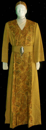 A “Kai Winn” (Louise Fletcher) costume with stunt components. The costume is a gold colored robe with patterned and flat elements, a pair of pleated front white shirts and a matching pair of trousers. The costume shirts are labeled differently, one reading ‘STUNT', another reading ‘Phillip Anglam’ EXTRA, emergency only’, … |