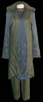 A costume worn by aliens who appeared in the “Voyager” crew's dreams during the episode “Waking Moments” of Star Trek: Voyager. Made of dark green fabric with accented fabric featuring green shag, the costume also features sewn on metal domes made to appear nailed in. The costumer’s tag indicates wear … |