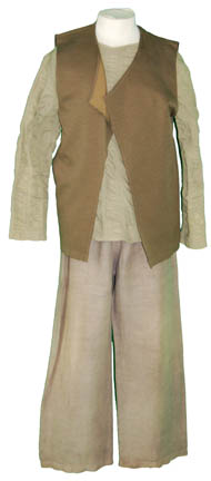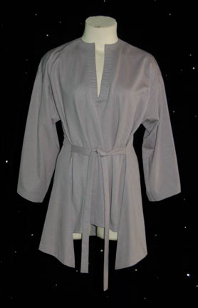 A casual off duty costume featured in Star Trek I: The Motion Picture. The costume is a soft set of cream colored trousers with an elastic waist and ankle cuffs, and a matching cropped sleeves shirt that has a crimped neckline and a waist tie. The item features an illegible … |