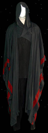 The costume consists of a light gray robe with patterned horizontal stripes, and a red stripe running round the belled sleeves and down the length of the fabric in the front. The robe zips up the back and clasps at the top. The sash is gold and silver separated by … |