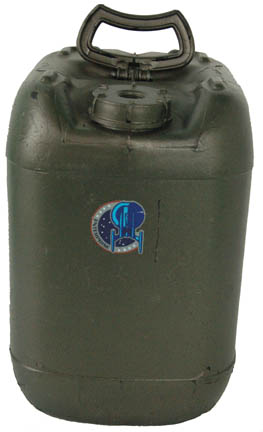A plastic can container painted gunmetal gray with a folding handle for saving space and a screw on lid. The vessel is generally rectangular in shape with rounded corners and features the famous “Enterprise NX-01” logo on the side with the lid. Measures approx. 10 X 15 X 12 inches. |