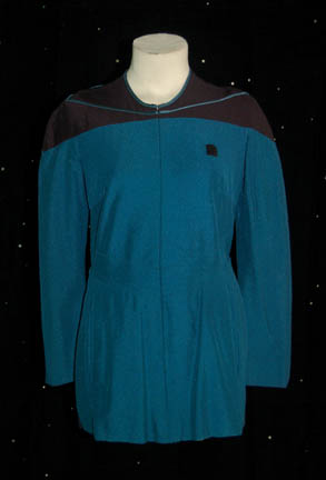 A rich blue Starfleet medical uniform top worn by Diana Muldaur while portraying “Dr. Katherine Pulaski” on Star Trek: The Next Generation season two while “Dr. Crusher” (GatesMcFadden) was the head of Starfleet Medical. Flared under the waist to accompany missing black uniform pants and with sciences blue piping around … |