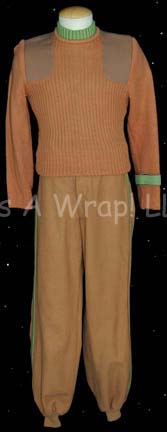 A caramel colored medical officer's uniform featured in Star Trek V: The Final Frontier for wear by DeForest Kelly in his portrayal of “Dr. McCoy”. The costume is wool trousers with green division stripes down the outside seam of the legs, a pair of green sleeveless undershirts with ribbed collars, … |
