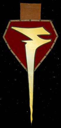 A tapestry featured variously through Star Trek episodic television. The tapestry is a large diamond shaped red velvety backing with shiny silver trim and multiple metallic silver colored resin studs placed in sequence around the item. The backing is braced and holds its shape when hanging by the brown leather … |