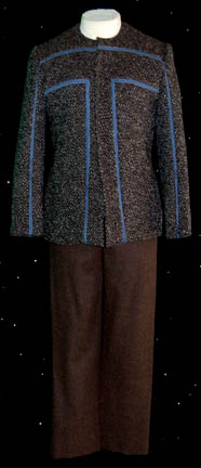 This costume was worn by one of “Zobral’s” (Clancy Brown) clan in the Star Trek: Enterprise episode “Desert Crossing” in which Zobral was the leader of a rebellion against the oppressive ruling Torothan clan on their homeworld. The costume includes black baggy pants, a blue short sleeved ribbed top, a … |