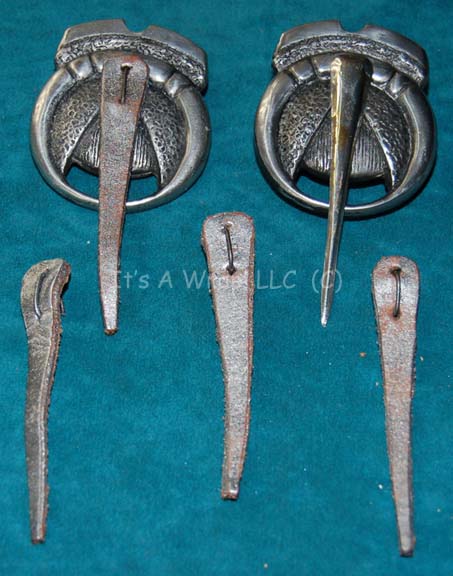 A pair of pewter colored metal ornaments for wear on the costumes of Triannon religious extremists featured in the Star Trek: Enterprise episode “Chosen Realm”. The broaches appear as a metal circle with adornment and a spike protruding from the bottom. One item is pin backed metal and of solid … |