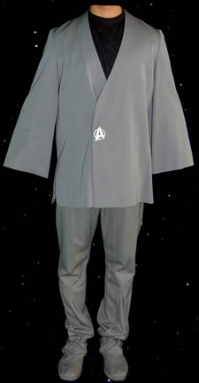 A gray Class-A costume featured in Star Trek I: The Motion Picture with elements for wear by Leonard Nimoy in his portrayal of “Spock”. The costume is a set of gray trousers with attached shoes, a gray uniform top with an attached plastic bio-monitor and remaining threads from removal of … |