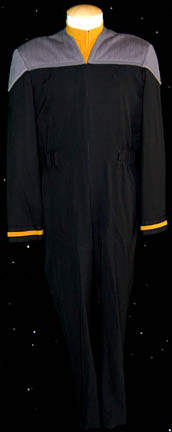 A costume featured in the Star Trek: Deep Space Nine episode “Rules of Acquisition”; wherein “Quark” (Armin Shimerman) is ordered by the Grand Nagus to open up the first trade negotiations with a Gamma Quadrant species, the “Dosi”. This costume consists of long-sleeved, full-length, black jumpsuit that is open halfway … |
