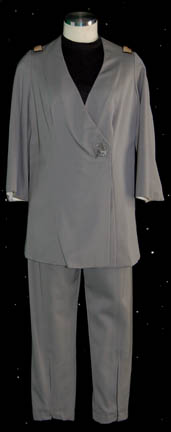 A gray Class-C uniform made for wear in Star Trek I: The Motion Picture by Majel Barrett in her portrayal of “Dr. Chapel”. The costume is a set of gray trousers with a matching gray jacket wrap top that features a waist tie and a Velcro placement to seal the … |