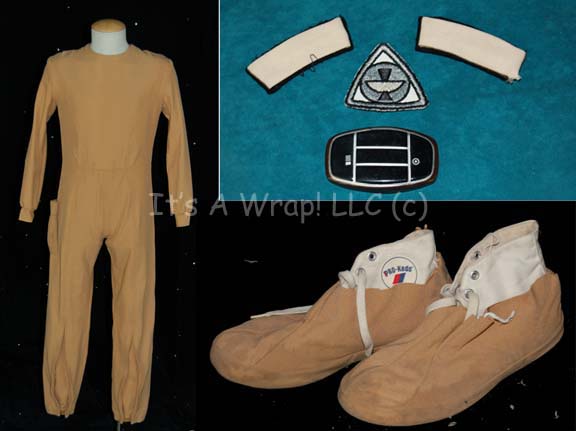 A tan colored Class-D Starfleet Uniform jumpsuit featured in Star Trek I: The Motion Picture. The costume features an open topped pocket on the right thigh, a pair of matching unattached cloth covered shoes, an unattached plastic bio-monitor, a pair of command white division strips for the shoulders, and a … |