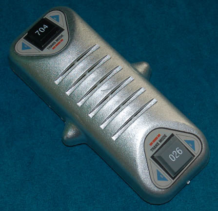 A prop featured in the Star Trek: Enterprise episode “Demons” for wear on costumes as a ‘universal translator'. The item is molded plastic painted metallic silver with a pair of graphical applications adhered to two sides and corresponding faux rubber buttons with numeric values. The item also features a Velcro … |