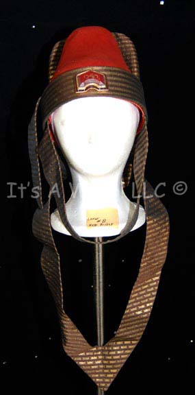 A costume element similar to those featured in various Star Trek feature films. This item is a rust-colored, felt, hat in the Vulcan-style featuring metallic brown and gold-colored stripes around the lip of the hat forming a chinstrap and second strap that comes to a point on the chest; a … |