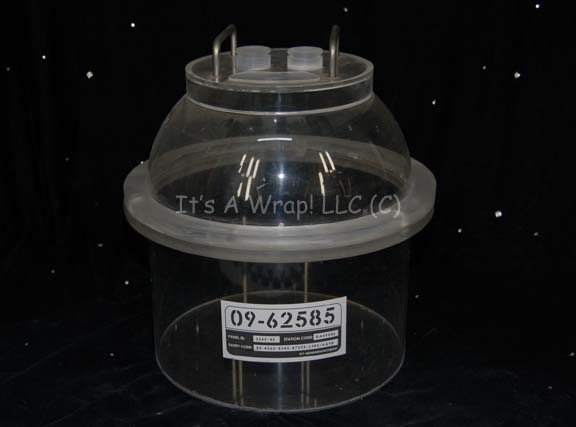 A mid-sized container appearing as set dressing in the sickbay set on Star Trek: Enterprise. The item is a clear acrylic container with a domed lid that features several raised elements to suggest hardware and a side mounted Starfleet inventory application. The item measures approx. 13.5 X 15.25 inches diameter. |