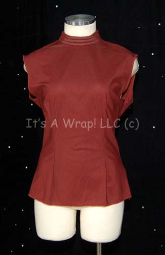 A rust colored costume shirt believed to have been created as an alternative to items that appeared on screen. The item is a sleeveless shirt with a metal zip spine and horizontally ribbed collar. |