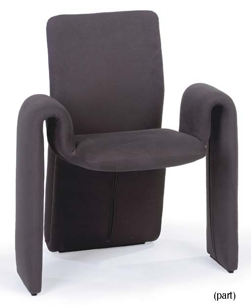 Two curvilinear armchairs covered in grey imitation suede -- <I>33in. high</I> -- used as set dressing in several sets on <I>Star Trek: Voyager</I>, including the Brenari quarters in episode 204 (2) |