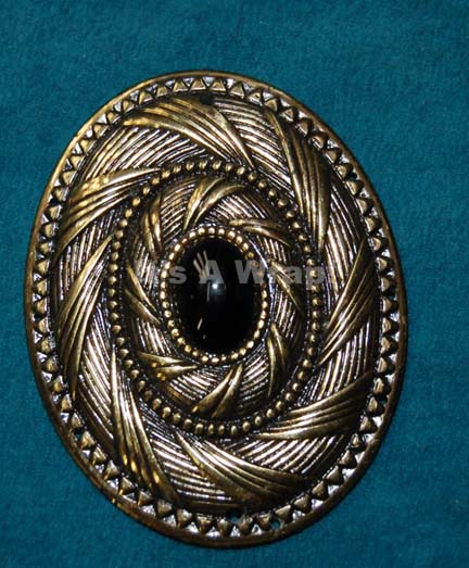 A character costume accessory like those appearing in multiple episodes of Star Trek: Deep Space Nine like “Playing God” and “Blood Oath” for use by Terry Farrell in her portrayal of “Jadzia Dax”. The item is a hair barrette decoration made from gold colored metal which has been painted down … |