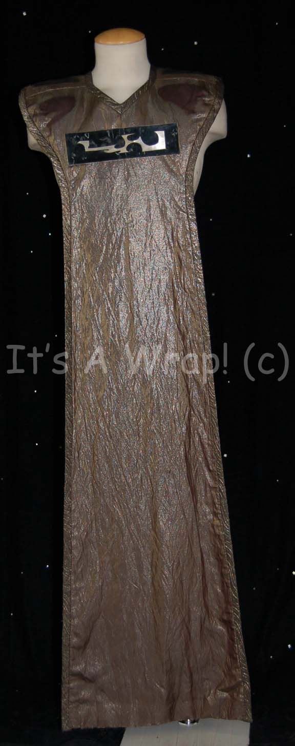 A Vulcan themed costume tabard believed to have appeared in Star Trek III: The Search for Spock. The item is a full length tabard with a black interior lining and an iridescent gold colored exterior fabric. A slight degree of fading around the shoulders is visible. The item is adorned … |