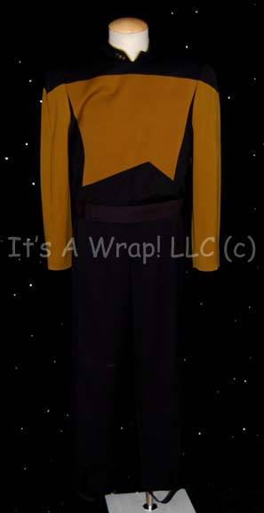 A costume featured in various episodes of Star Trek: The Next Generation for wear by Le Var Burton in the role of “Chief Engineer Geordi La Forge”, it is a black, long-sleeved, Starfleet uniform jacket featuring Operations gold across the front, back, sleeves, and as piping along the Mandarin collar; … |