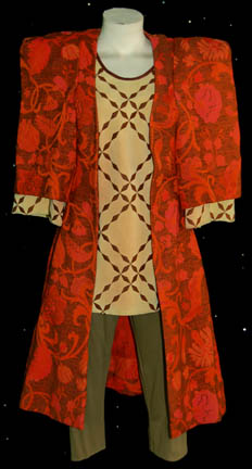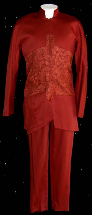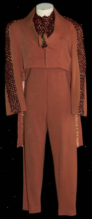 A costume featured in the Star Trek: The Next Generation episode “Inheritance” for wear by an “Alien Aid”. The costume is a two piece rust colored wool crepe jacket and trousers. The costumer's tag indicates wear by ‘Johnaton Paley’ and asserts a ‘rust brocade midriff inset with pocket–nehru collar’. |
