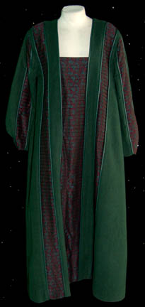 A costume robe featured in the Star Trek: The Next Generation episode “Rightful Heir” for wear by a “Klingon Priest”. The costume is a full length robe colored green with pleated accents on the sleeves and body to appear ribbed. The costumer's tag reads ‘249 Rightful Heir, Priest, Irving Ross, … |