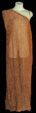 A costume purportedly sold during the famous Christie's Auction in October of 2006, at least by description, Lot number 589 “Troi’s Goddess of Empathy Dress”. Verified by screen capture and costumer’s tag this costume is olive green and teal chiffon that snaps at the side. A braided gold and blond … |