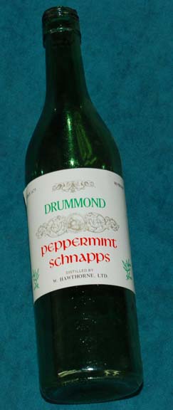 A special effects breakaway bottle acquired for Star Trek episodic television. The item is composed of green colored sugar glass made for stunts and a safer shatter on screen. The item features an adhered white colored label with Victorian style graphics indicating the non-existent contents to be ‘Drummond Peppermint Schnapps, … |