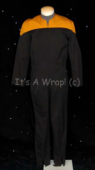 A Star Trek: The Next Generation female Operations gold Starfleet uniform made for wear during the series and/or ‘The Next Generation' movies. The jumpsuit is black with Operations gold sleeves and upper torso. There is gold trim around the collar, a small Velcro patch on the left breast for a … |