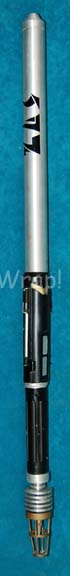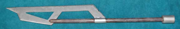 A prop Klingon painstik like those featured in the Star Trek: The Next Generation episode “Reunion”. The item is a silver colored metal rid with black colored Klingon iconographic lettering adhered to it, with a black colored molded resin grip at the fore, and a fashioned metal electrode prod end. … |