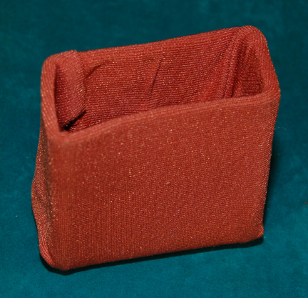A prop Bajoran PADD holster like those appearing variously in episodes of Star Trek: Deep Space Nine. The item is a leather holster with rust colored spandex fabric wrapped around the exterior and a Velcro placement on the reverse. The item measures approx. 3.5 X 3.5 X 1.25 inches. |