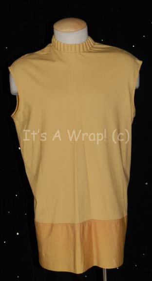 A tan colored sleeveless undershirt created for use in Star Trek feature films. The item is sleeveless and features a metal zip up the spine. A sewn in Paramount tag reads ‘Size 10’. |