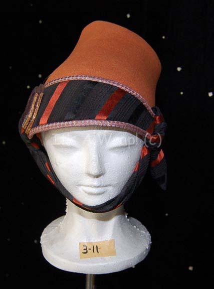 A costume element similar to those featured in various Star Trek feature films. This item is a rust-colored felt, Vulcan-style hat featuring a wide trim of black with textured, diagonal black stripes, as well as darker black, and a darker shade of rust; in addition there is a there is … |