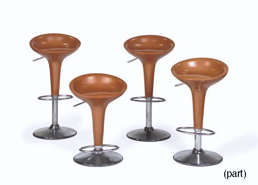 Six futuristic bar stools with coral-colored fiberglass seats and chromed metal bases -- used in numerous episodes of <I>Star Trek: Enterprise</I> and <I>Star Trek: Voyager</I> (6) |