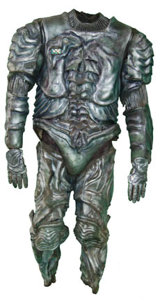 A black full length cast rubber body suit painted with silver details to give it an armored appearance, with matching gloves, and boots. The right breast features a pair of green lights that are molded into the costume and activated by a battery box housed behind the left shoulder, which … |