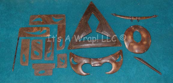 A set of molded resin costume components created for use on Federation Security Council alien costumes which appeared in Star Trek IV: The Voyage Home and Star Trek VI: The Undiscovered Country during the Khitomer Accords. The items are irregularly shaped with holes made for sewing on to a costume. … |