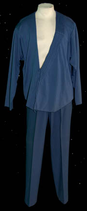 A costume featured in the Star Trek: The Next Generation episode “First Contact” for wear by Jonathan Frakes in his portrayal of “Commander Riker' while in disguise as a Malconian while on an anthropological survey of the nearly warp-capable species. The costume is blue trousers with a matching top featuring … |