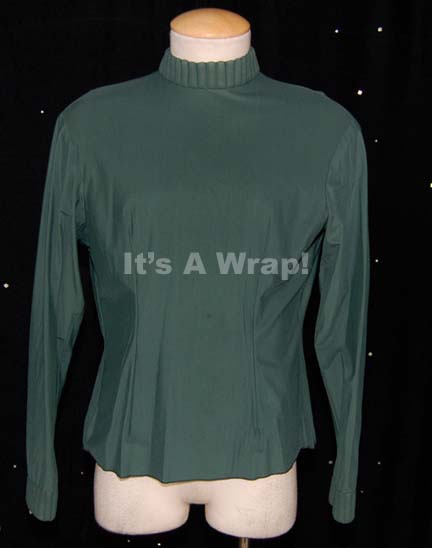 A costume element featured in the third Star Trek feature film “The Search for Spock” for wear by phaser armor security division officers. This item is a long-sleeved, Starfleet uniform undershirt in forest green for the Security division, with a trapunto-style collar, and zip up the back. The item is … |