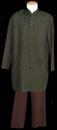 A costume featured in the Star Trek: Enterprise episode “Fusion” for wear by “Kov” (John Bland), a Vulcan engineer who held multiple misconceptions of humanity. The costume is mustard colored trousers with black zigzag lines and a wrapped over cuff style at the ankles, and a green crinkle texture top … |