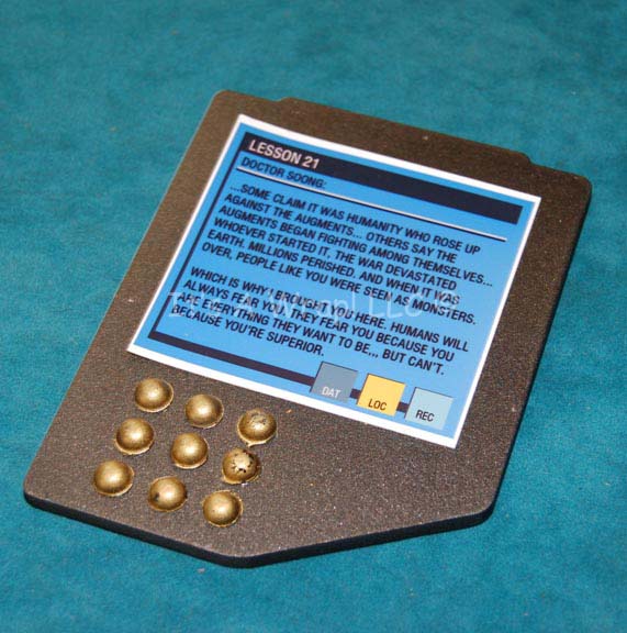 A sturdy PADD (Personal Access Display Device) featured in the episode “Cold Station 12” painted metallic pewter with applied gold painted rubber accent ‘buttons' and an application graphic depicting ‘Lesson 21, Dr. Soong’ and an essay on why ‘augments’ are superior to homo sapiens; the reverse features a graphic application … |